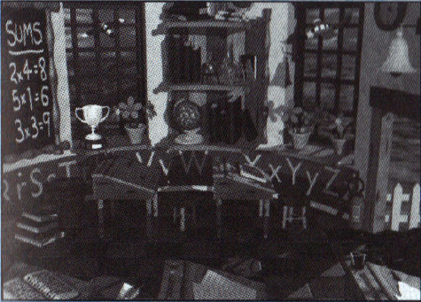 The questions on the chalkboard are quite hard to see, and they have not been answered yet, unlike DKC2 SNES and the Kong Kollege render. The first question seems to say "2 + 4", while the second one seems to ask "5 + 4", and the third and final one doesn't seem to be a question but just random scribbles on the board... Did a Kremling get frustrated trying to answer a question?