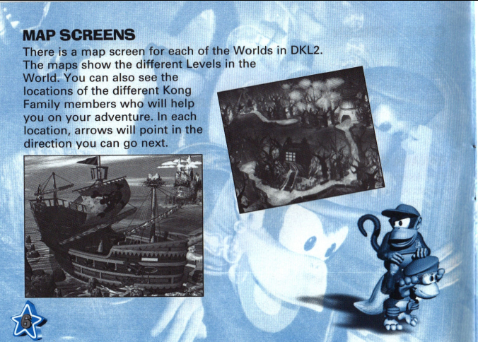 When I first got DKL2 and read the manual ← new link!, I noticed that there were quite a few errors in it. It seems that Rareware copied DKC2's manual and didn't put much effort into proofreading it. (And the funny thing is that I got DKL2 long before DKC2, so I remember being confused at some of these errors!) Unfortunately, I lost the manual many years ago, but I still recall some of the errors present in the manual*. Here are a few examples: