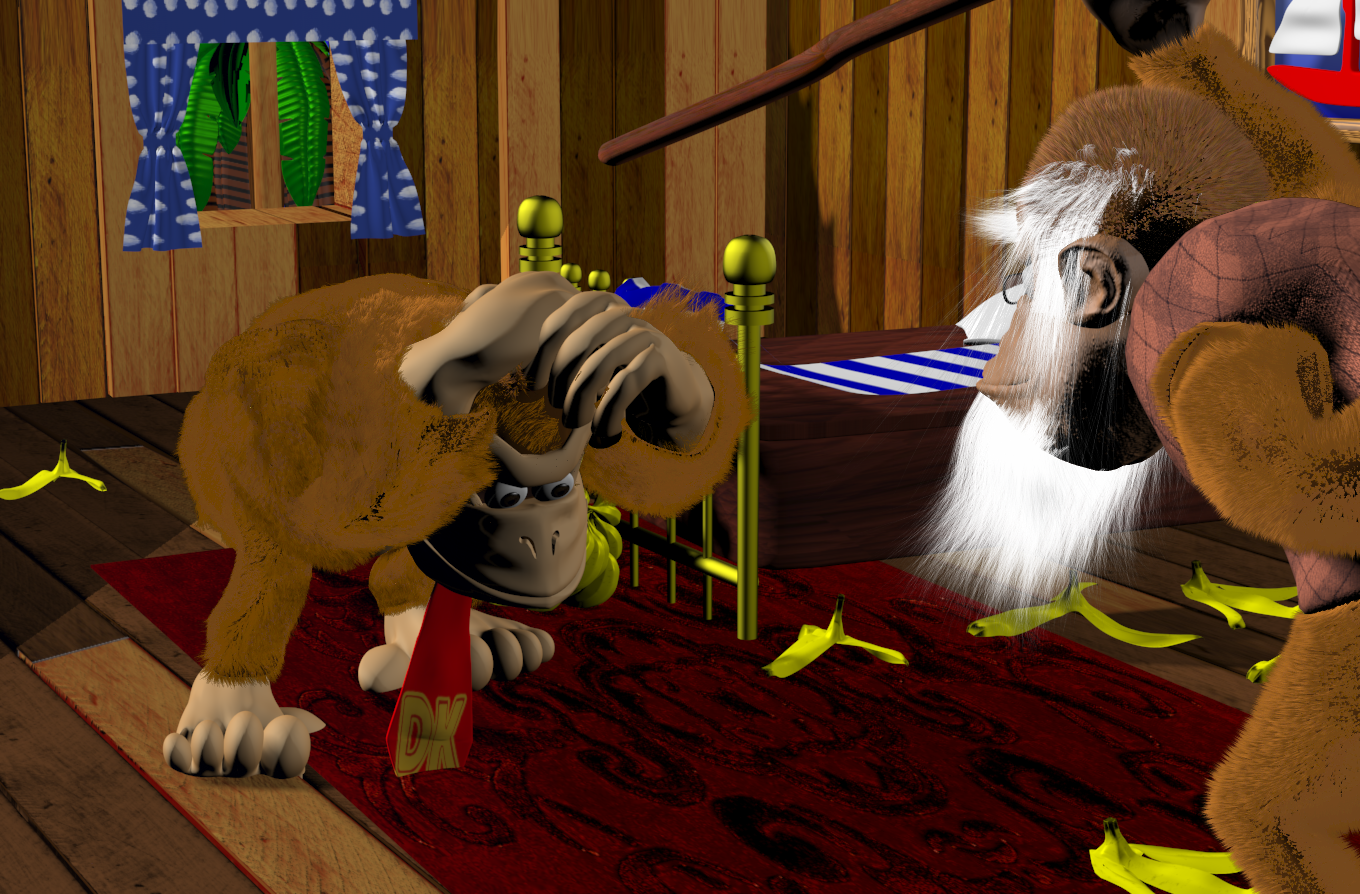Here is the same scene with a different pose and improved fur and fur lighting. I think DK's head should show more. I think a few different camera angles during the animation would help, so you see his face.
