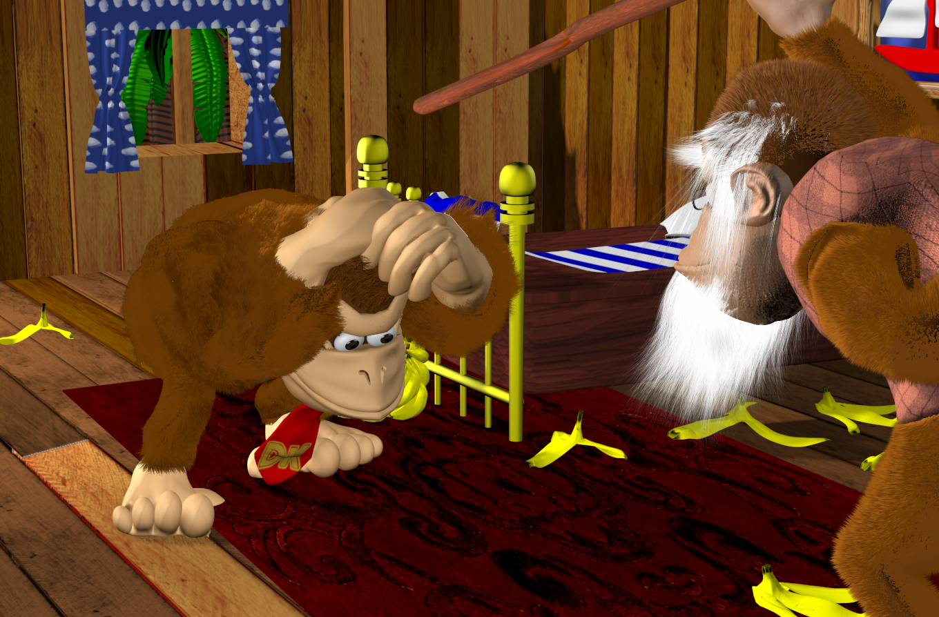I also Included a test composition with Cranky in DK's house. Lacks shadows and proper lighting. It's just to get the an idea of what the final shot could look like. This scene is where Cranky Gets mad at DK for not watching over his hoard of bananas.