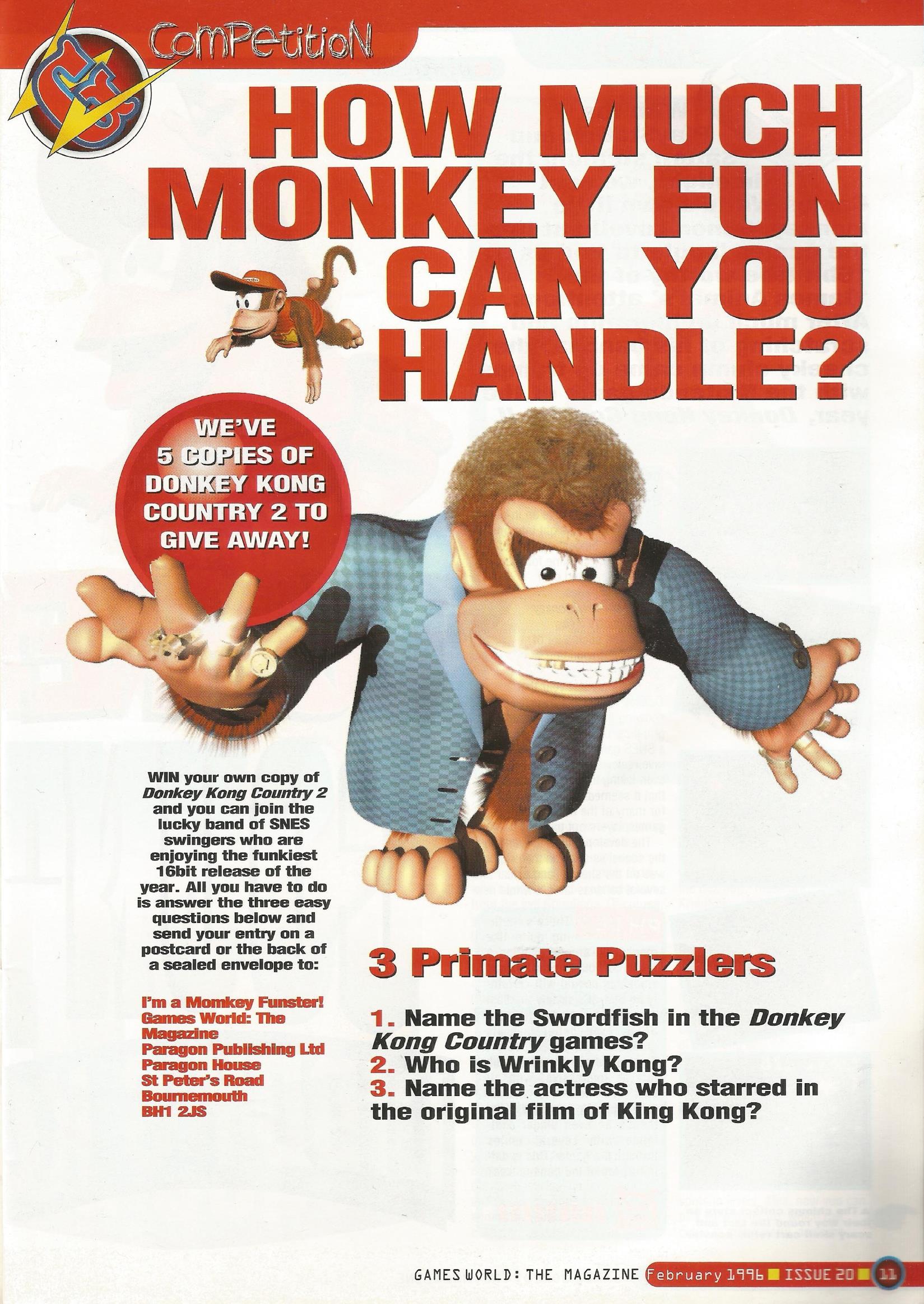 I quote myself from the blog 'cause it's late and I'm really tired and too lazy to type; They mention how it’s a adventure racing game with challenges, praise its diversity in gameplay but lament on the silver coin challenges. And you could win a VHS tape of the Donkey Kong Country cartoon, which could be won by answering the following question; "What animal is Donkey Kong?"