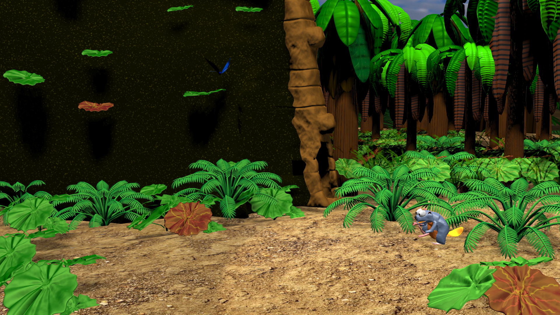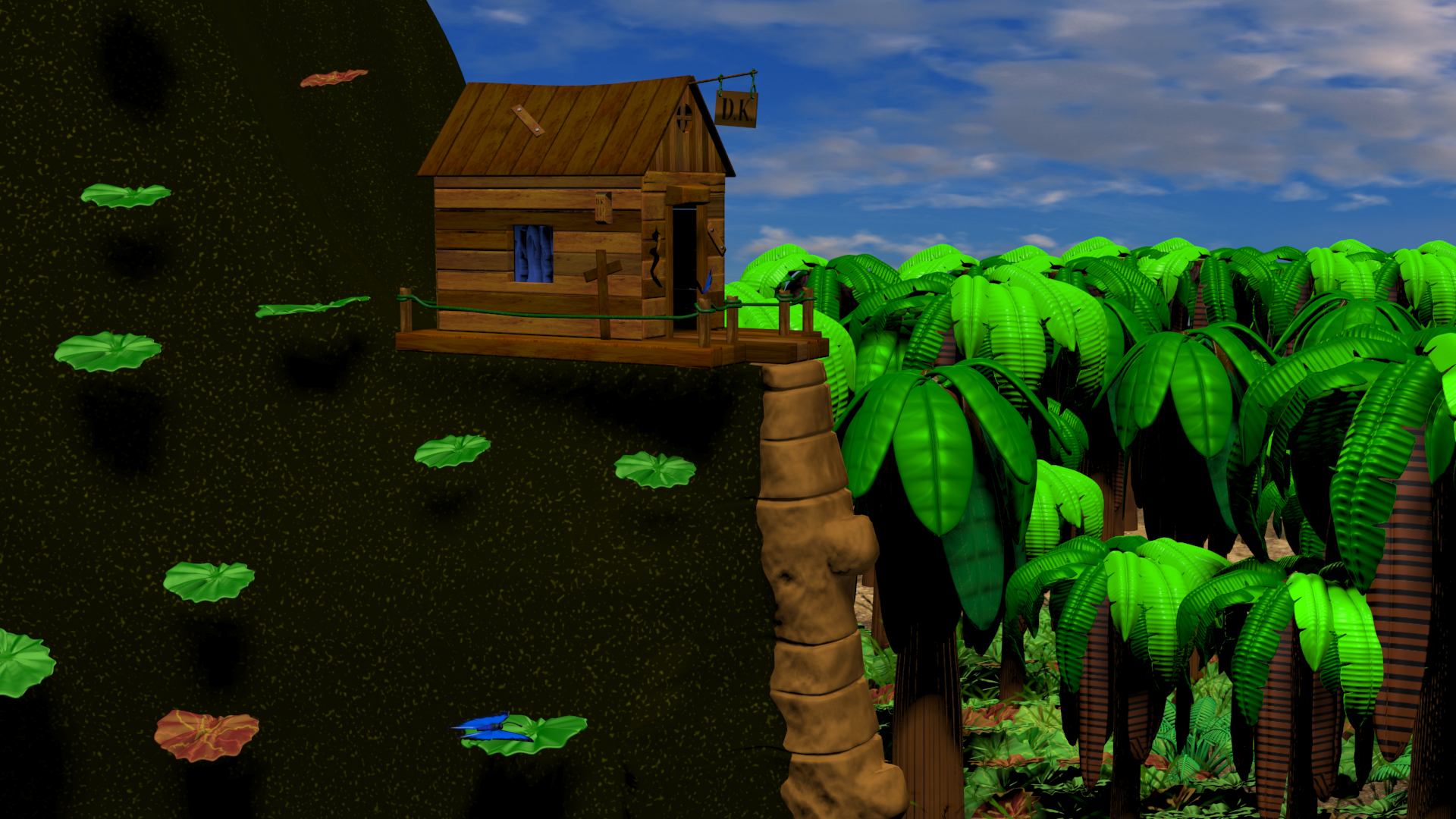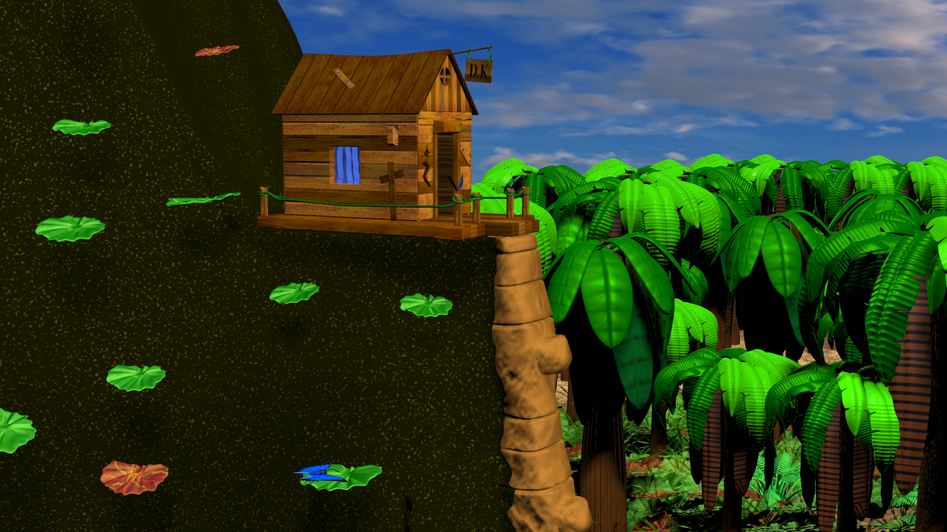 I added the Gnawty and butterfly in the above shot and I think I will add some very low poly seagulls in the background.