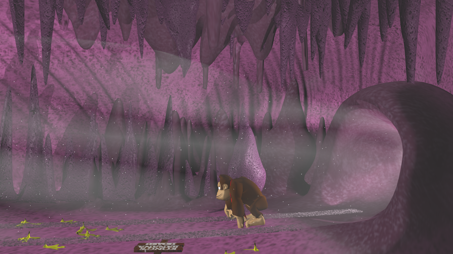 I made some changes to the the cave entrance scene mentioned in previous posts. I fixed the shadows, reduced the brightness and flicker of the dust particles and added movement in them caused by DK's movement. I can reduce the speed of them if they are moving too fast. No changes were made to DK's animation.