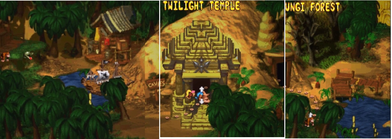 The first level is Jetty Jungle which takes place on the DK Icon before Kongo Jungle in DKC1, from then the first world scrolls over to the far side of DK Island with a transition from the original DKC1 map to the new world map.