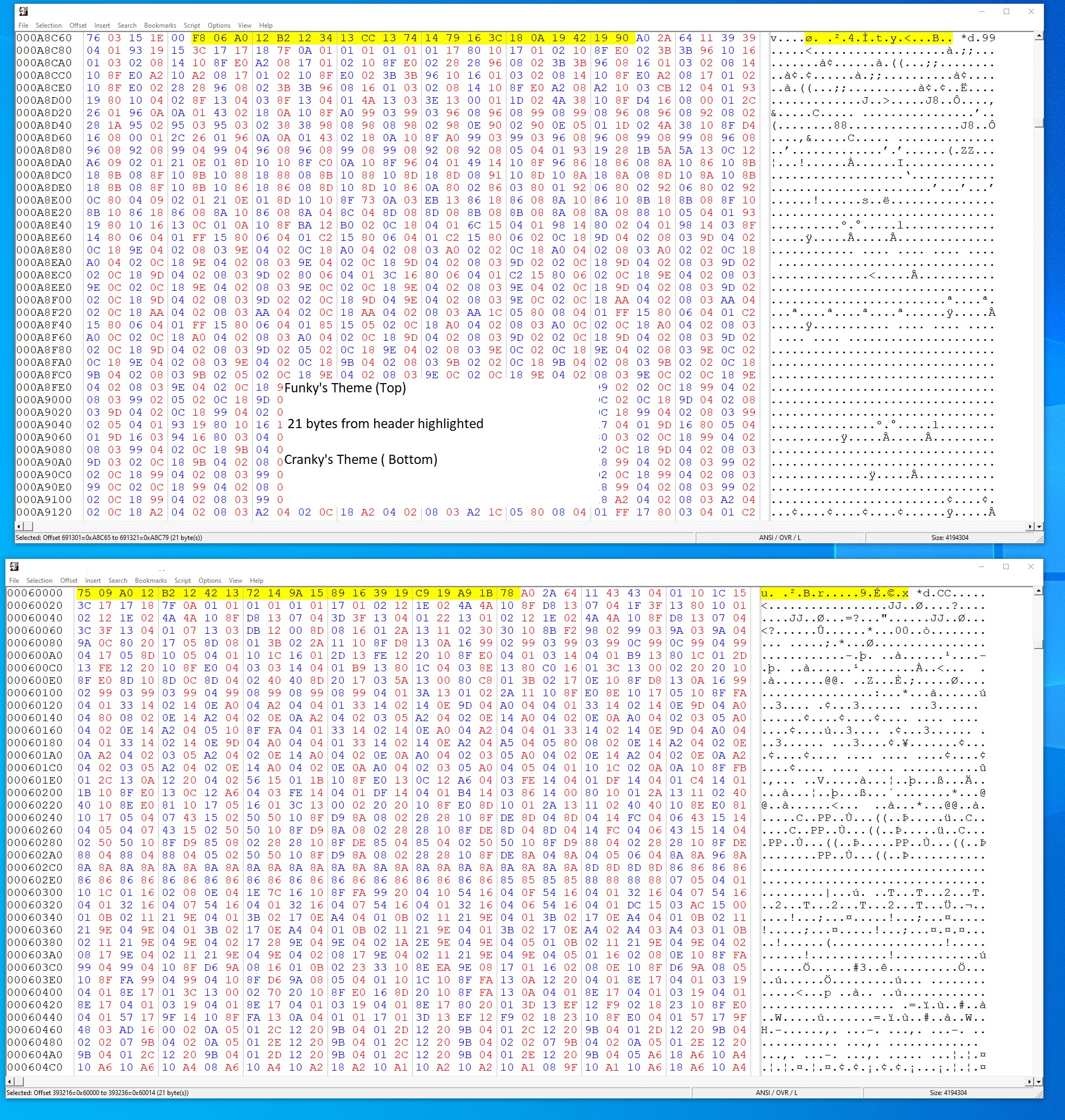 Also, your image is VERY painful to look at. I believe I mentioned always putting hex viewers at 16 or 32 bytes per line. This makes it easier to jump a certain amount of bytes, as those numbers are regular with how addressing works. Hex is base 16. Kingizor can no doubt explain this point better :)